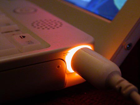 Apple NB的變壓器有個一貫的優點,利用燈光來顯示電池充電狀態,充電中為橘色,充飽後變綠色。VAIO也有類似的燈光設計,但我已經不記得是不是會顯示電池充電狀態。